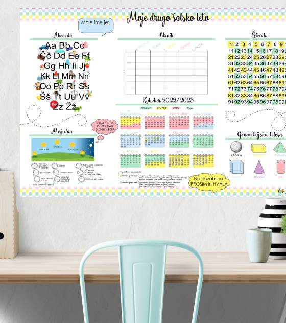 Čudovit izobraževalni plakat za drugošolce, z abecedo, števili do 100, dnevom in uro, geometrijskimi telesi, urnikom in koledarjem z označenimi počitnicami ter letnimi časi...vse s čemer se bodo šolarčki seznanili v svojem drugem letu OŠ.