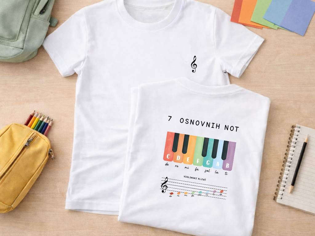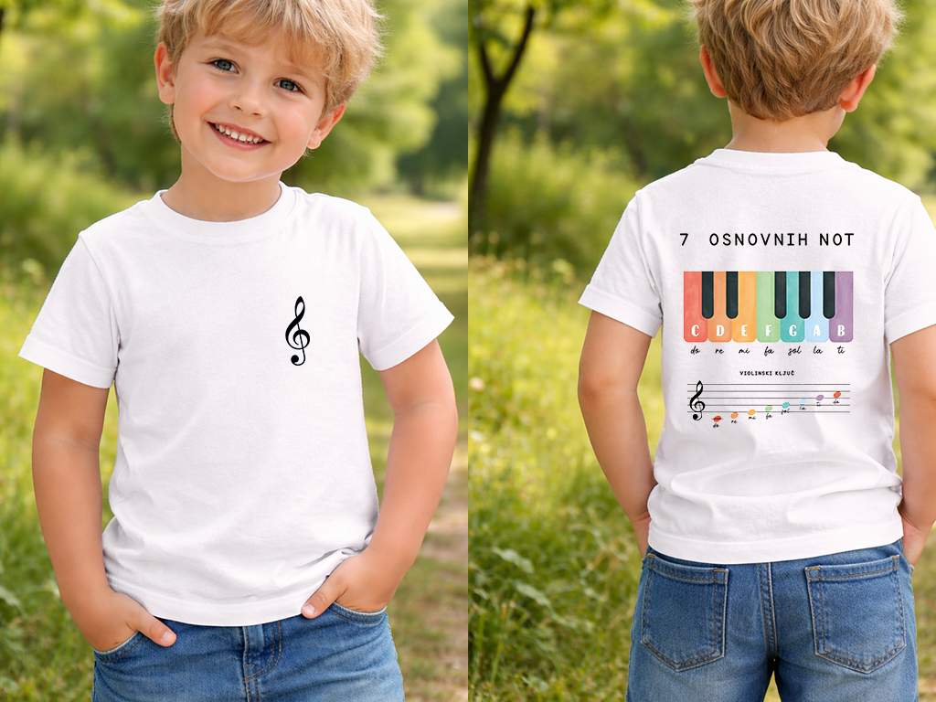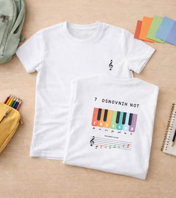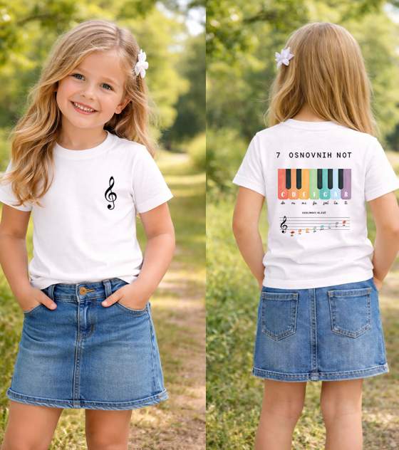 Otroška organska majica - izobraževalni potisk s sedmimi osnovnimi notami - okolju prijazna in udobna