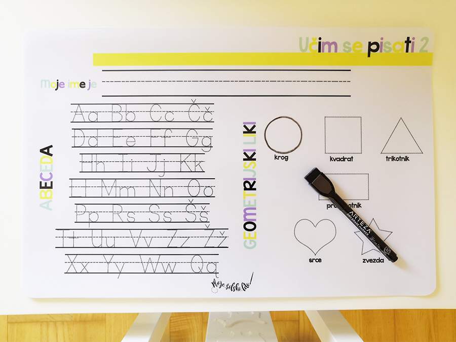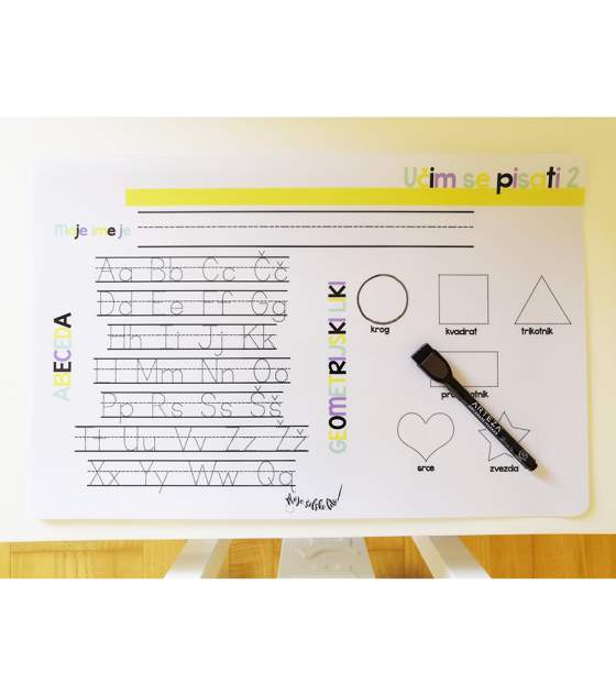 Na njej se vadi pisati velike in male tiskane črke ter like, prav tako je tudi zaščita, da se miza med hranjenjem ne umaže.